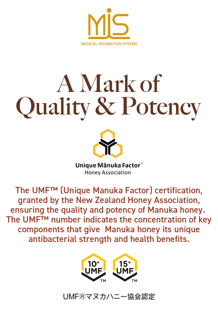 UMF (Unique Manuka Factor)is a quality trademark that measures the potency of Manuka Honey’s beneficial compounds, such as MGO, DHA, and leptosperin. A higher UMF rating indicates greater bioactive strength and effectiveness. The UMF rating is an important standard to ensure the authenticity and quality of Manuka Honey.